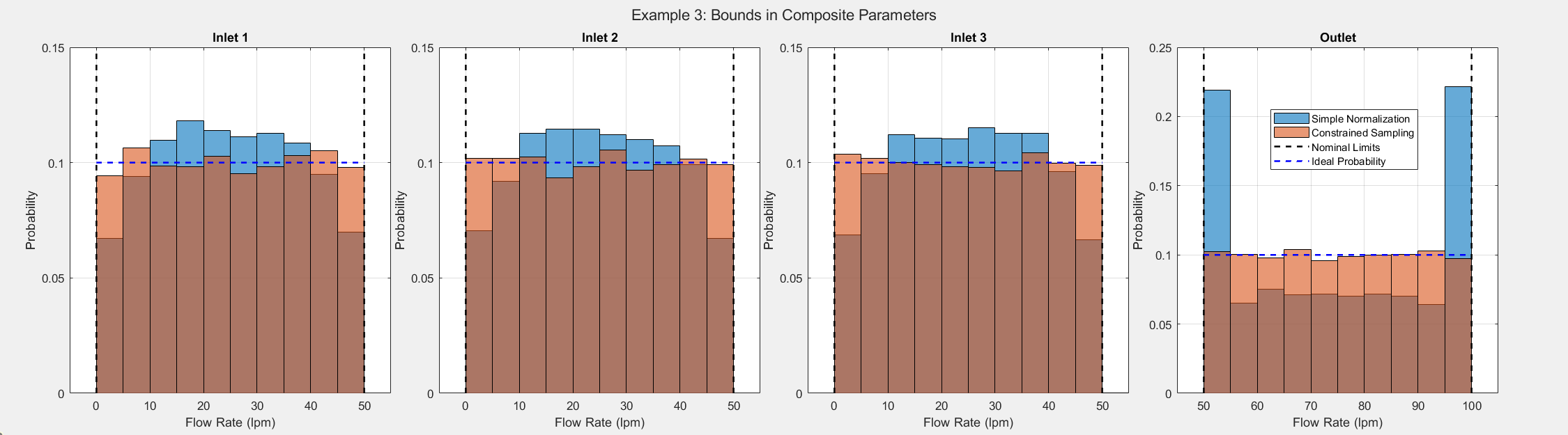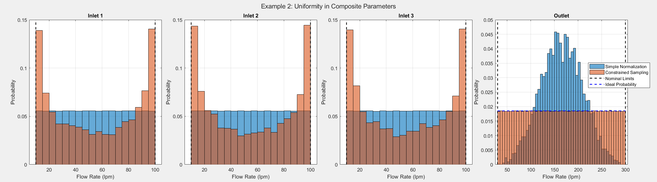The simple sampling method resulted in skewed samples, with relatively few inlet flow rate samples near the edges of their bounds. The outlet flow rate distribution also had low sample counts in the middle of its range. In contrast, the proposed constrained approach produced samples where all distributions closely resembled the ideal uniform distribution.